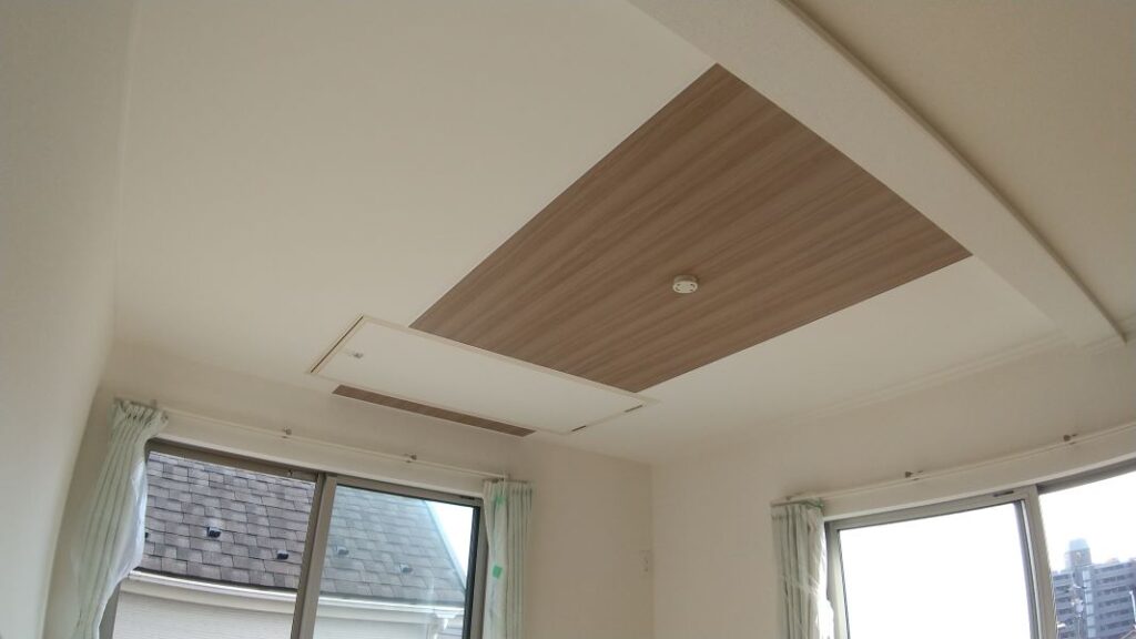 - 天井仕上は中央部分に木目調化粧パネルを貼り周りはクロス仕上です。