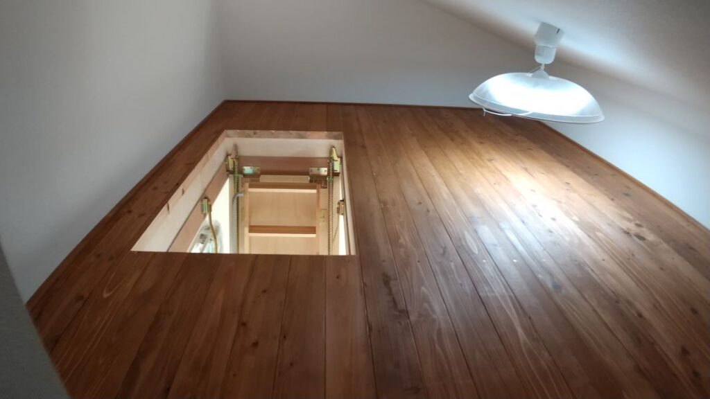 - エアコンの効きが悪いため高天井部分を通常の天井高さに変えたいがロフトも使いたいと言う事で、小屋裏収納を提案させて頂きました。